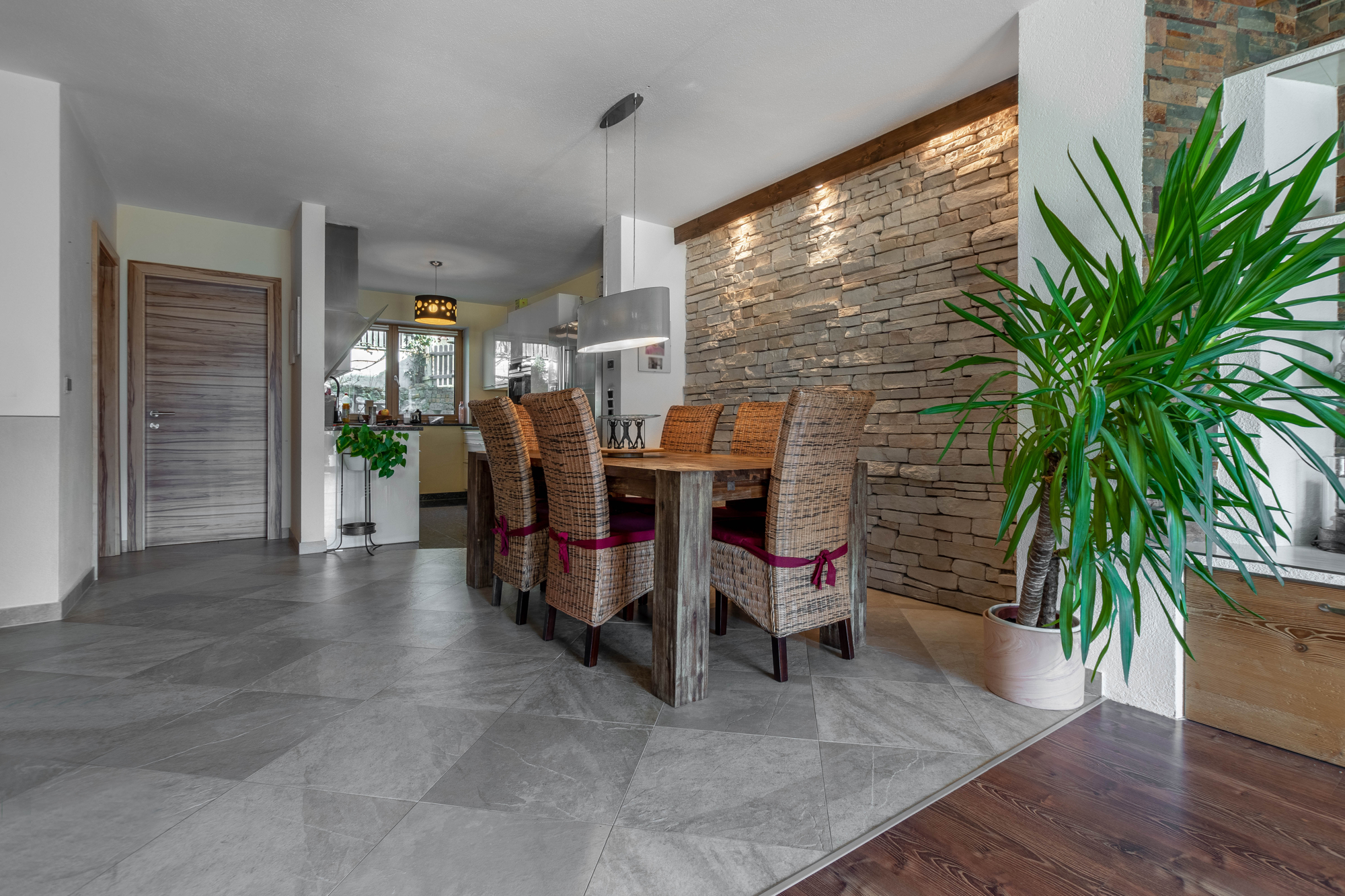 Durch die innenliegende Treppe erreicht man das erste Obergeschoss, in welchem sich der geräumige Wohn-/Ess-/Kochbereich, ein weiteres Schlafzimmer und ein Gäste-WC befindet. Von dem Wohnbereich aus gelangt man auf eine rund 30 m² große Sonnenterrasse.