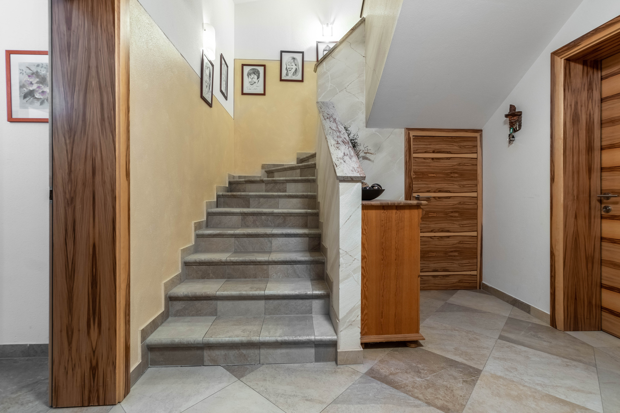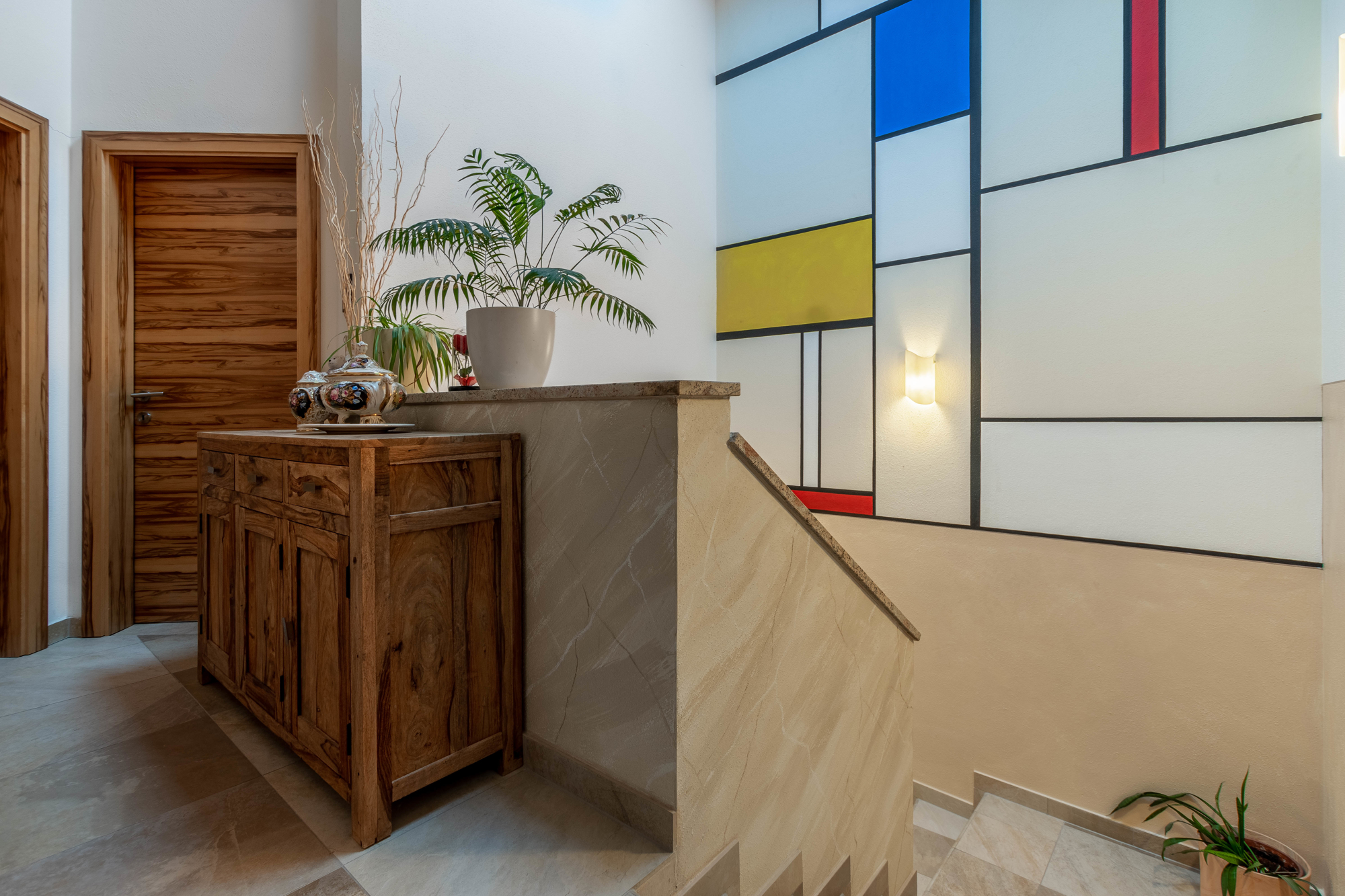 Betreten wird die Immobilie durch einen kleinen Empfangsbereich mit angrenzendem Büro. In der selben Ebene findet man noch einen Technikraum, ein Schlafzimmer sowie eine Waschküche.